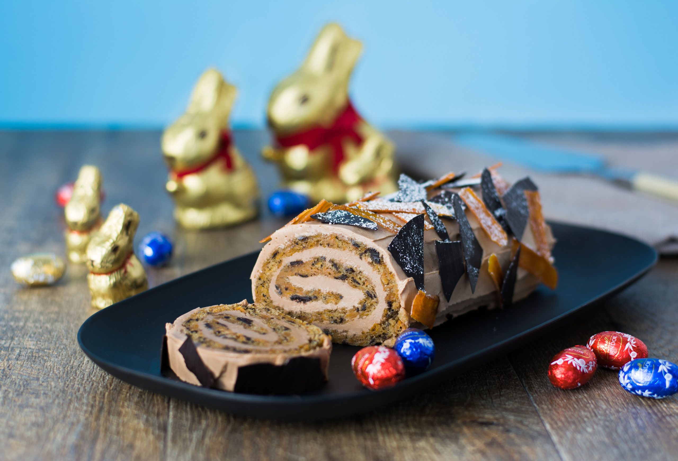 Para finalizar, desenrole o rocambole resfriado e coloque com um pouco do recheio de cream cheese. Enrole novamente, segurando para cobrir o exterior, e decore o prato com Lindt Gold Bunny ao Leite.
